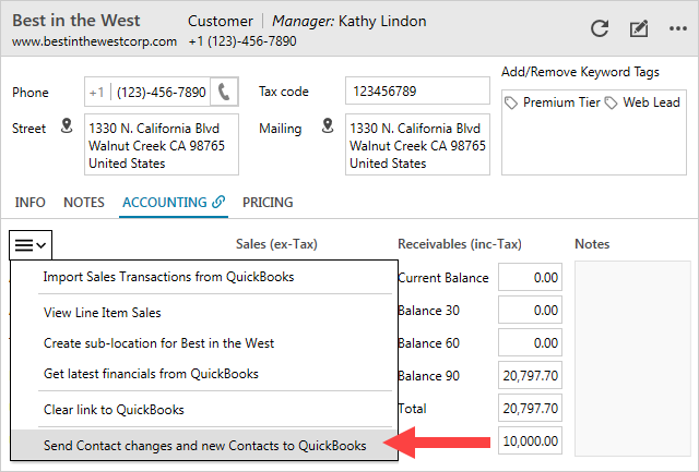 Once you edit or add new contacts to a company, go to the ‘Accounting’ tab in the company record. Click on the drop-down menu and select ‘Send Contact changes and new Contacts to QuickBooks’.