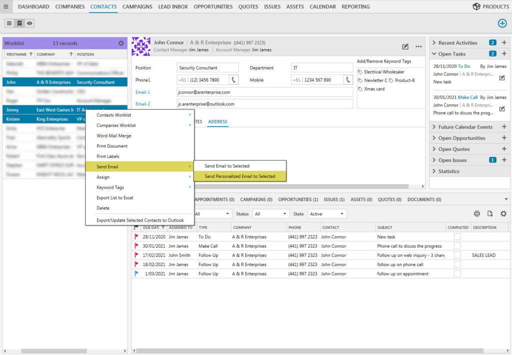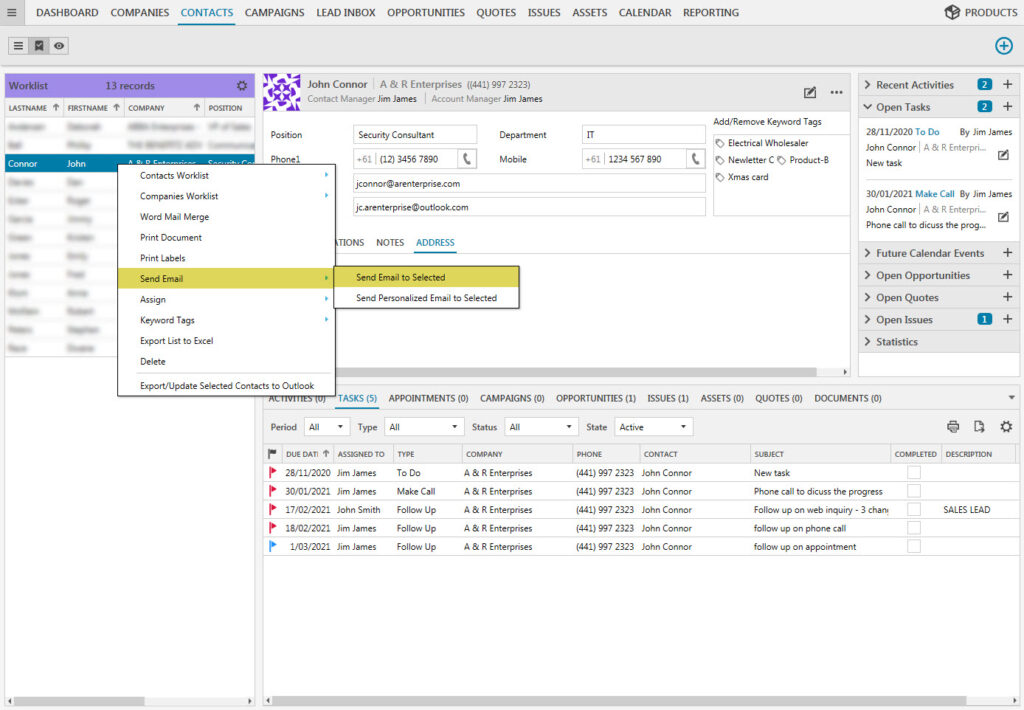 To email a selected contact via Legrand CRM right-click on the contact and select ‘Send Email to Selected’.