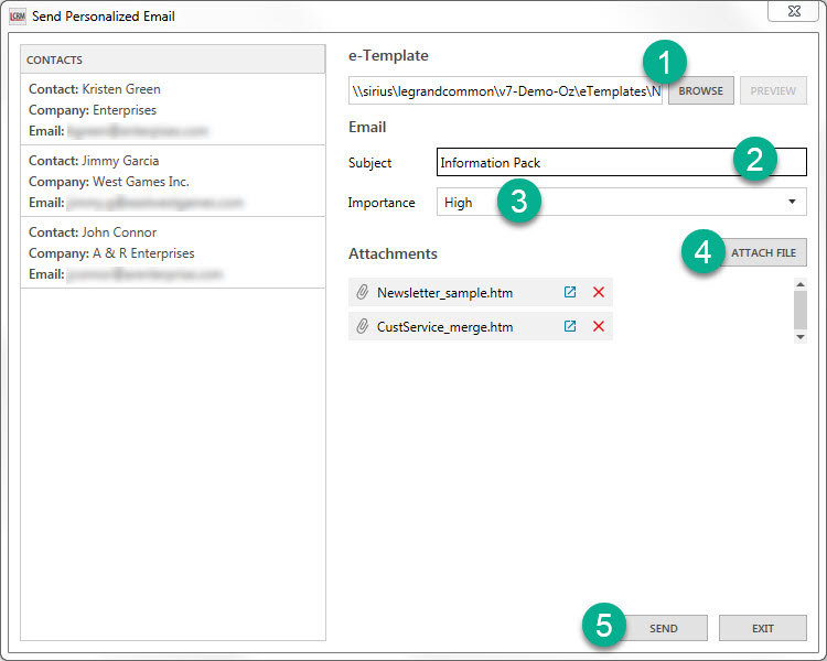 The address/addresses you selected to receive the email are displayed on the left column. Click ‘BROWSE’ to select an e-Template file. Type in the email’s subject, select the email’s importance and add optional attachments. After you complete the email click ‘SEND’.