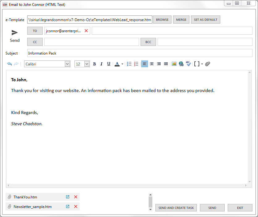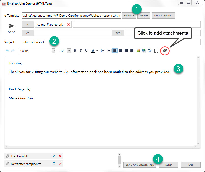 In the new window, type in a subject, add optional attachments and complete the message. Legrand CRM also enables you to send a custom email using e-Templates. Simply click ‘BROWSE’and select your e-Template file. After you complete the email, click ‘SEND’ or ‘SEND AND CREATE TASK’ to simultaneously record the a new task.