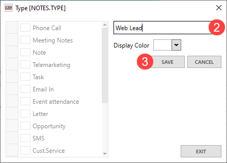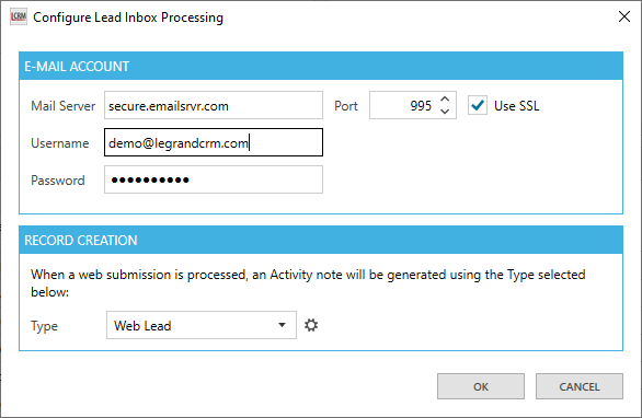 Legrand CRM generates an Activity Note when you process and record a lead. In the Lead Inbox settings, you can specify the activity note type.