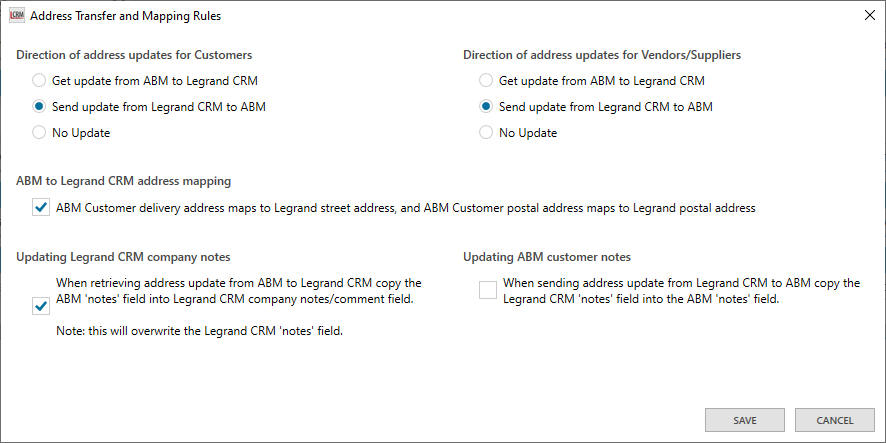 Select ‘Get update from ABM to Legrand CRM’ if you want ABM to control Customers’ or Suppliers’ addresses and receive updates in Legrand CRM from ABM.