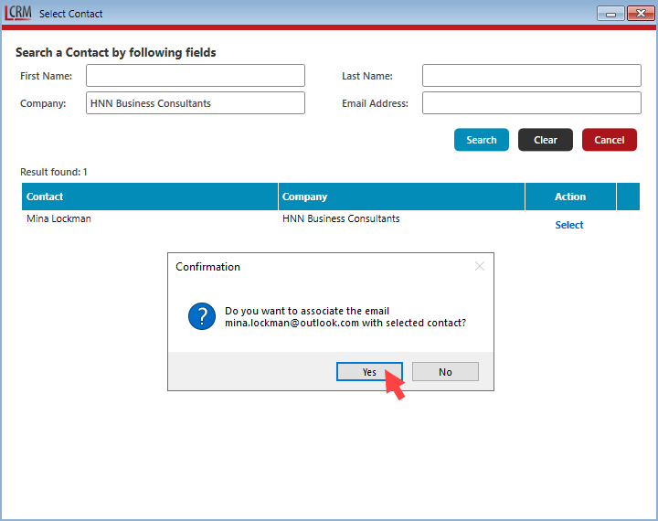 Once you select the contact, click ‘Yes’ to associate the email address with the selected contact.