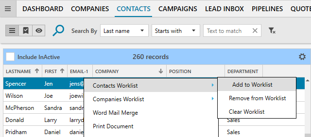 If you are in the Companies module, select Contacts Worklist > Add Primary Contacts to Worklist or Add All Contacts to Worklist.