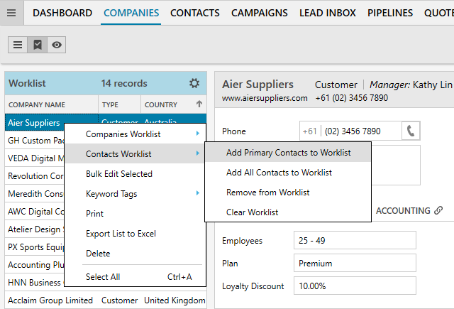 Right-click on a company from the companies list and select Companies Worklist > Add to Worklist. You can also bulk-select and assign multiple companies or contacts to the worklist at once.