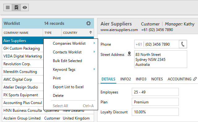 Right-click on the company record to bulk edit, print, assign keyword tags, export to Excel and more.