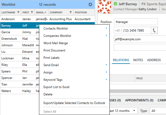 Right-click on the contact to use the Contact Worklist features. You can create a Word mail merge, print documents, print labels, send emails, assign selected contacts as targets for a campaign, assign keyword tags, export list to Excel or export selected contacts to Outlook.