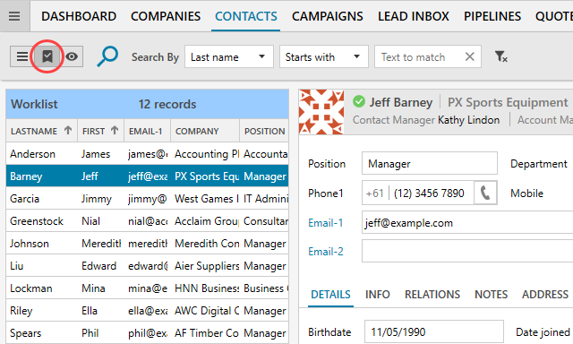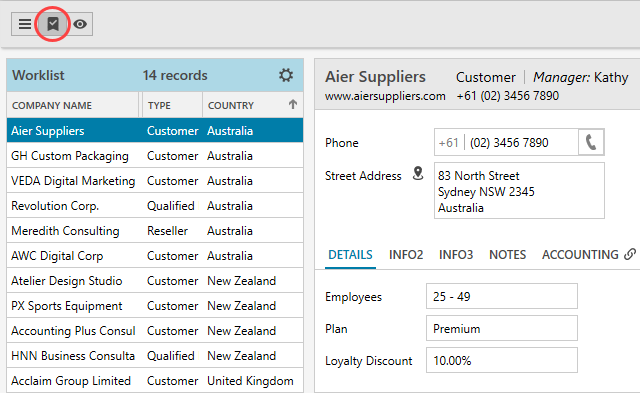 Click on the icon shown to open the Company Worklist. You can record CRM activities using the quick access toolbar and store documents below.